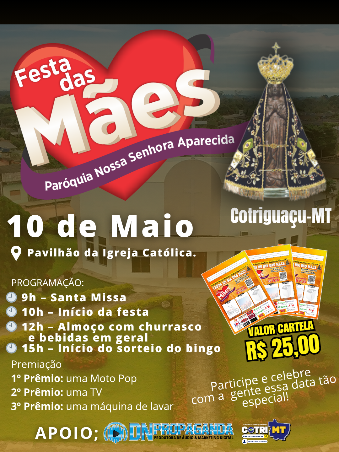 A Paróquia Nossa Senhora Aparecida, em Cotriguaçu, promove no próximo dia 10 de maio a tradicional Festa do Dia das Mães. O evento será realizado no Salão Paroquial e deve reunir fiéis e moradores em um momento de celebração, fé e confraternização.