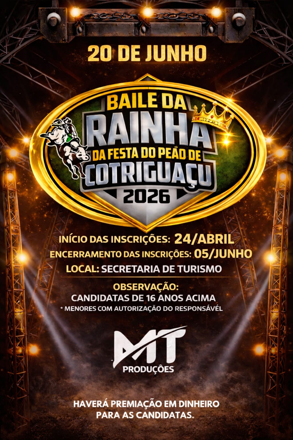 A cidade de Cotriguaçu já movimenta o calendário cultural com a chegada de mais uma edição do tradicional Baile da Rainha da Festa do Peão 2026. O evento, produzido pela MT Produções, promete agitar a região e reunir candidatas de toda a cidade em uma noite de festa, emoção e reconhecimento.