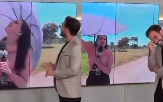 A repórter levou a situação na brincadeira e ainda disse que eles deveriam fazer uma pauta a respeito das sombrinhas. “Vamos fazer uma matéria sobre a qualidade das sombrinhas? Quanto que você gastou no ano? Nenhuma presta”, afirmou a profissional.
